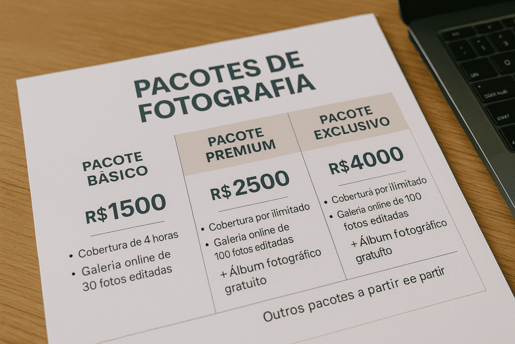 Eu estruturo minha escada de valor com três patamares. Um pacote de entrada que protege margem e atende quem precisa começar. Um pacote preferido que concentra benefícios e vira a escolha da maioria. Um pacote premium que eleva a marca e ancora percepção. Em casamentos, isso pode significar presença estendida e álbum fine art. Em infantil, mais tempo de sessão e impressões. Em produto, prioridade na fila e direção criativa.