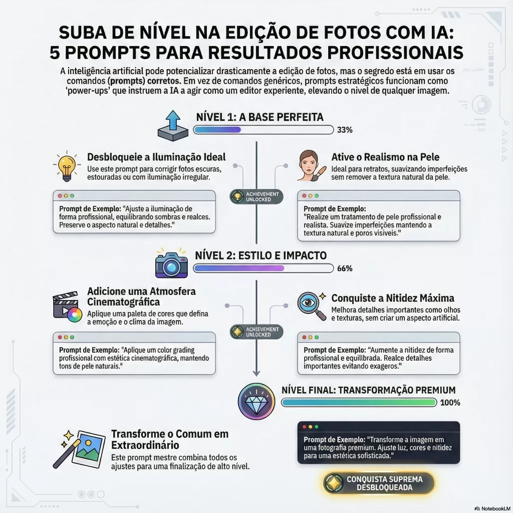 Além disso, os melhores prompt para editar fotos não funcionam isolados. Eles funcionam melhor quando você entende contexto, qualidade da imagem original, iluminação base e objetivo final daquela foto. Por isso, ao longo do artigo, eu sempre explico quando usar cada prompt e quando evitar.