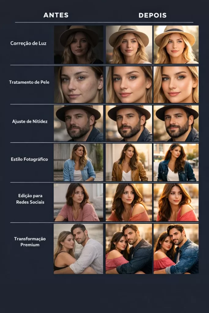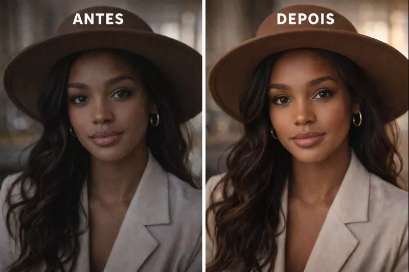 Além disso, ele melhora detalhes importantes como olhos, cabelo, roupas e texturas do ambiente, mantendo um aspecto natural e profissional.