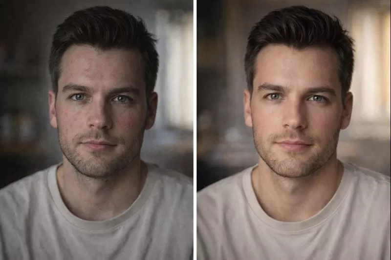 Realize um tratamento de pele profissional e realista. Suavize imperfeições temporárias como manchas e olheiras, mantendo textura natural, poros visíveis e características reais do rosto. Evite efeito artificial, preservando um aspecto humano e fotográfico de alta qualidade.